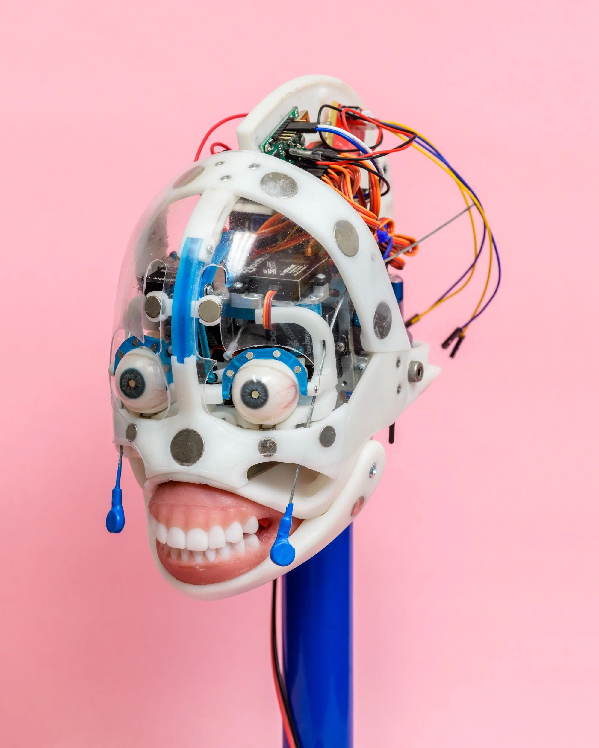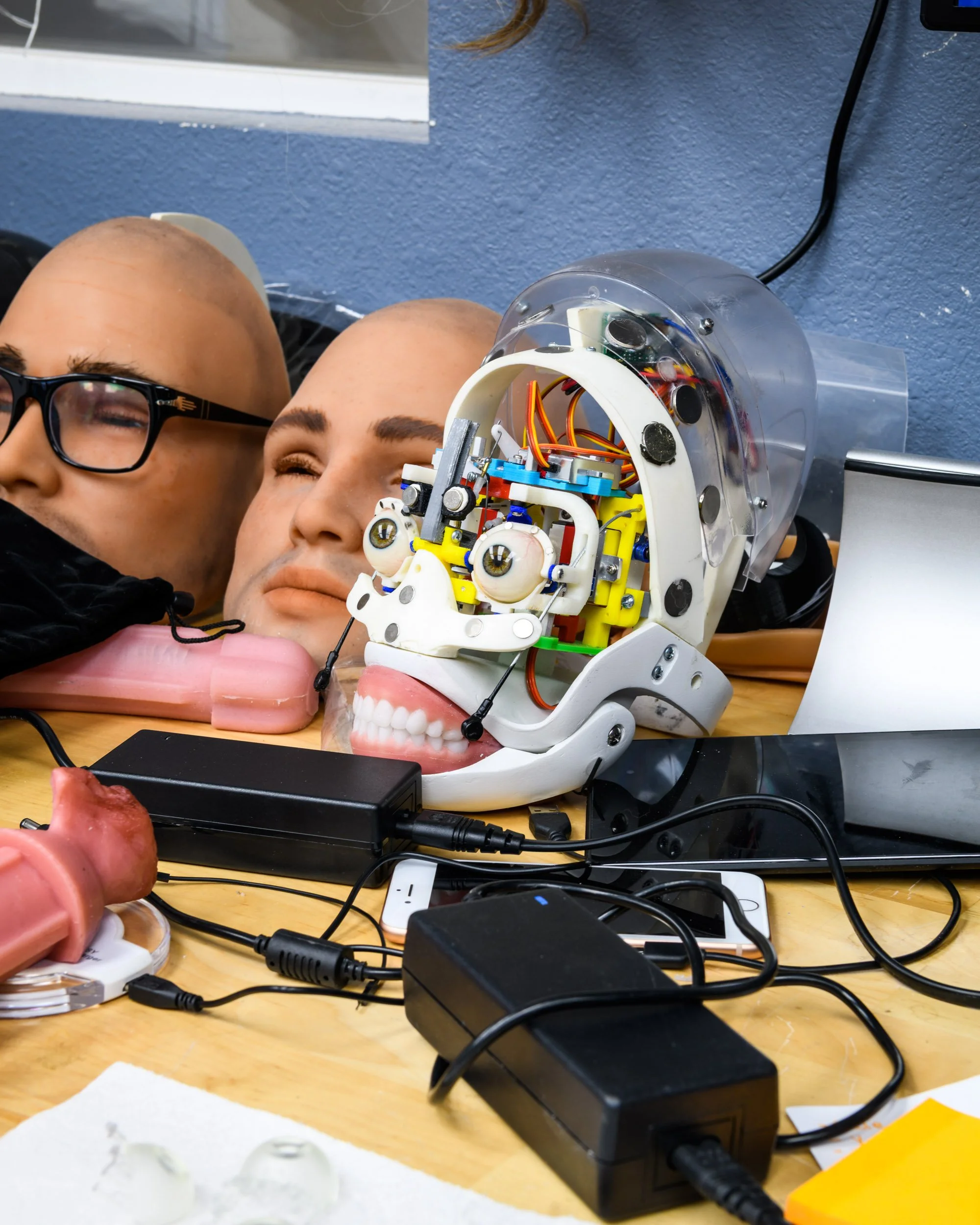 A robotic head at the RealDoll robot workshop in San Marcos